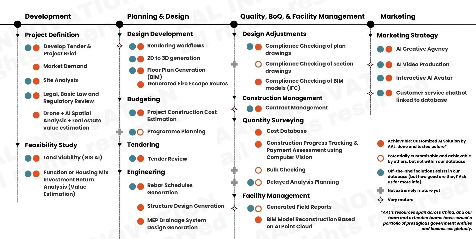 At AAL INNOVATION, we provide a complete ecosystem of AI services, one-stop-shop tailored for the Architecture, Engineering, and Construction sector. From strategic planning to hands-on implementation and training, we guide your enterprise through every step of the AI journey.
